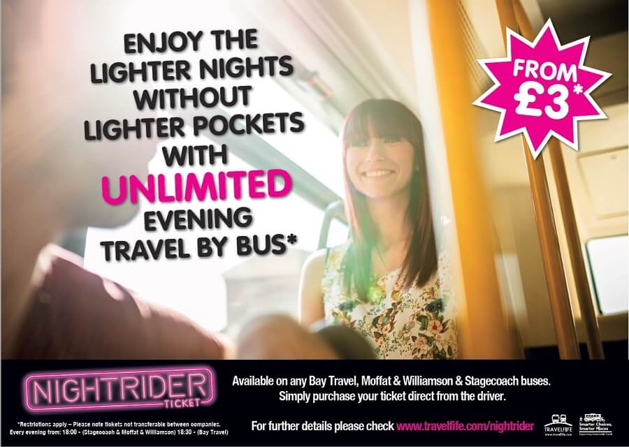Nightrider tickets are available on any Bay Travel, Moffat & Williamson & Stagecoach buses.